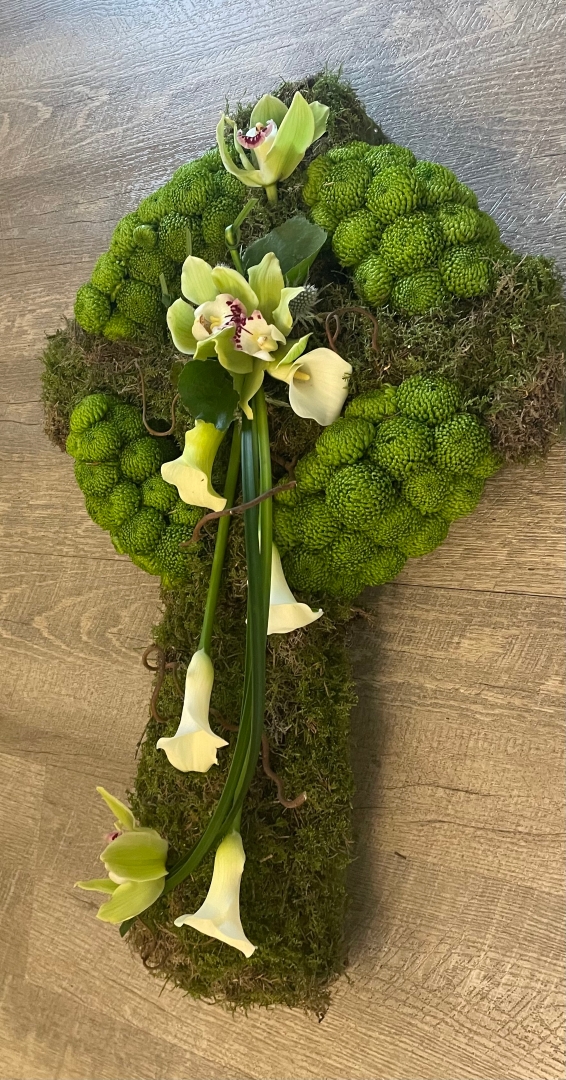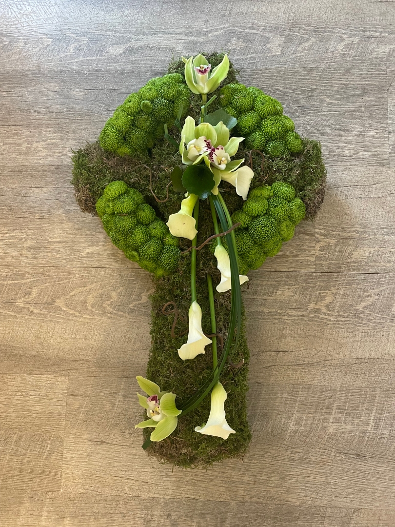 Celtic Cross based with moss and Kermit Chrysanthemums.  Finished with a calla lily spray